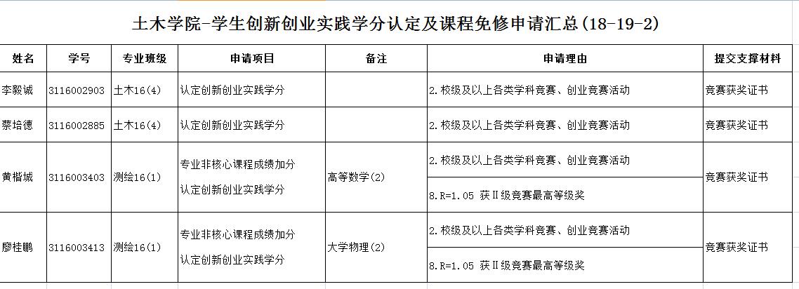 根据教务处《关于做好2018-2019学年度第二学期本科生申请创新创业实践学分认定及课程加分、免修等工作的通知》的精神,我院对照《禁漫天堂app 创新创业实践学分认定及课程免修实施暂行办法》对学生递交的申请进行初审,现公示如下。